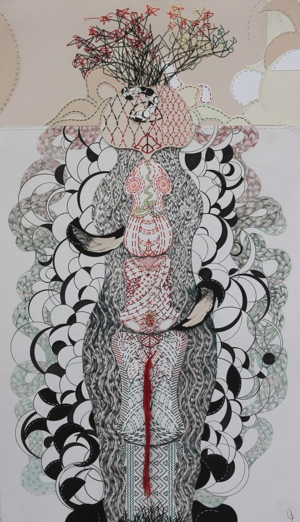 Crayon graphite, pierre noire, aquarelle, encre et couture sur papier