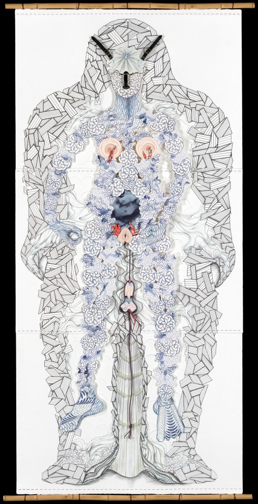 Dessin de second plan de 105 x 225 cms à l’encre, crayons, marqueurs, coutures, bambous.