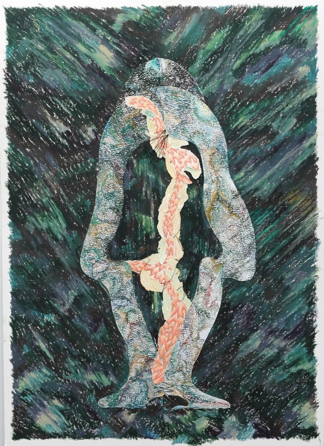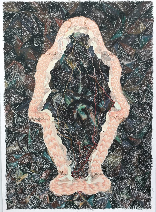 Crayons, pierre noire, fils sur papier (Pencils, black stone, sewing on papers)