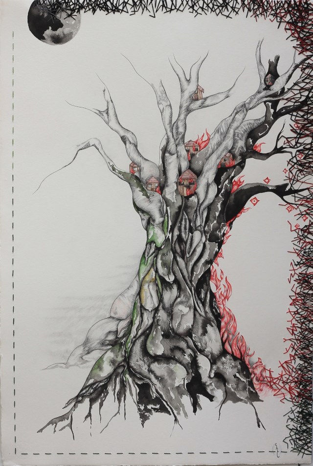 Crayon graphite, pierre noire, aquarelle, encre et couture sur papier