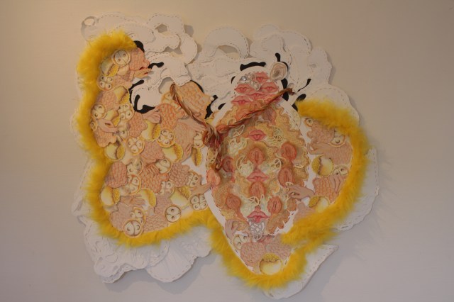 Papier découpé et recousu sur peaux tannées, fourrure synthétique, cordons cuir, latex.